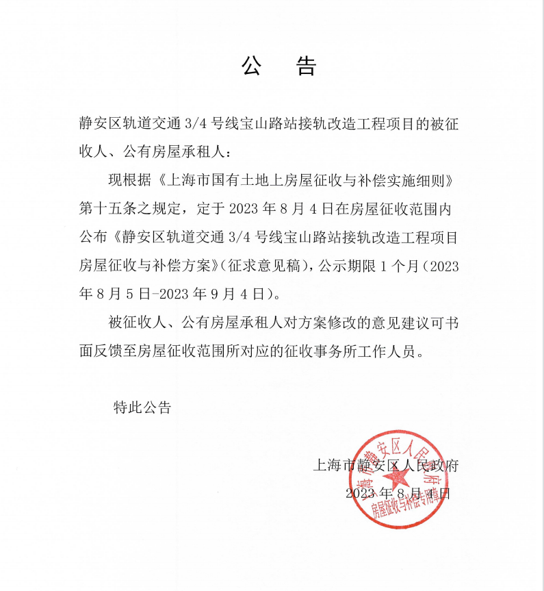 点击蓝字 关注我们 好消息! 8月4日,静安区轨道交通3/4号线宝山路站接轨改造工程项目房屋征收与补偿方案(征求意见稿)在交通路101号张贴公示啦,居民朋友们可以前往了解公示内容。 考虑到有些居民可能不方便现场观看,小宝也为大家准备了方案电子版,赶紧一起来看看吧~ 静安区轨道交通3/4号线宝山路站接轨改造工程项目房屋征收与补偿方案(征求意见稿) (向上滑动查看内容,文中图片请点击查看) 静安区轨道交通3/4号线宝山路站 接轨改造工程项目产权调换房屋选购办法(征求意见稿) (向上滑动查看内容,文中图片请点击查看) 静安区轨道交通3/4号线宝山路站 接轨改造工程项目居住困难户认定和补贴办法(征求意见稿) (向上滑动查看内容,文中图片请点击查看) 温馨提示 为方便各位居民研习,基地经办人员近日陆续将静安区轨道交通3/4号线宝山路站接轨改造工程项目房屋征收与补偿方案(征求意见稿)发送给居民。 居民朋友如有疑问,可根据自己房屋所在地址门牌,至基地与对应的征收事务所经办人员联系咨询。 常敬泉 律师 上海市德尚律师事务所合伙人 上海市律师协会不动产征收(动迁)业务研究委员会委员 扫描二维码 添加微信 北京东路668号科技京城西楼27B 联系电话:13816437460 往期精选